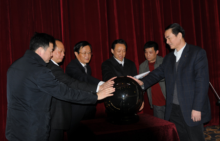 總經理張春雷(左三)與荊州市領導共同啟動水晶球 3月29日,枝江酒業與荊州新視界農村電影院線公司聯手,正式啟動“知心知己枝江酒,…