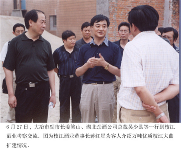 6月27日,大冶市副市長姜笑山、湖北勁酒公司總裁吳少勛等一行到枝江酒業(yè)考察交流。圖為枝江酒業(yè)董事長蔣紅星為客人介紹萬噸優(yōu)質枝江大曲擴建工…