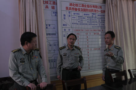 5月8日,宜昌軍分區(qū)司令員孟春林一行在枝江市人武部部長胡文雄、政委鄧正平等人的陪同下到枝江酒業(yè)檢查指導民兵組織整頓工作,基層組織建設工作。枝江酒業(yè)黨委書記張華、副總經理劉前生對來訪領導給予了熱情接待,并陪同參觀了枝江酒業(yè)展廳、包裝車間、釀造車間。