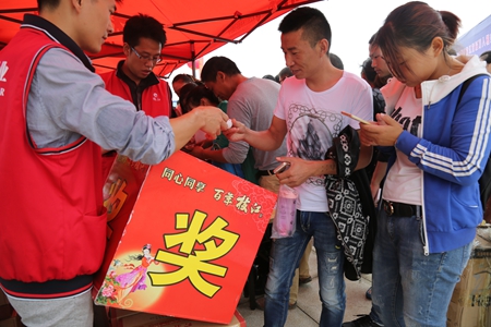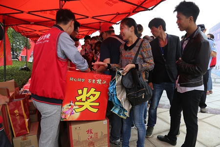 枝江酒業借用這樣的熱鬧場面,在相親活動現場進行微信掃碼贈酒活動,吸引了前來參加相親活動的各階層人士。在現場展示的產品有枝江王、百年枝江韻系列產品、情義結、謙泰吉1號、苦蕎酒等。參與者只要現場關注枝江酒業微信公眾號,分享到朋友圈,即可獲得一次抽獎的機會,分別會抽出“十五年經典”、“枝江情義結”、“小金版枝江王”、“小苦蕎酒”等不同價位的枝江酒。枝江酒業曾經在今年夏天,利用枝江市納涼晚會舉行微信掃碼贈酒活動,與枝江市民有效互動,讓枝江人“家家抱得美酒歸”成為酒城風景,而在此次相親節上,在“千年等一回”的浪漫中,“相親抱得美酒歸”又一次成為枝江這座中國白酒名城的風景。枝江市婦聯準備了豐富的文藝節目,在舞臺的大屏幕上,重復播放著枝江酒業出品的《酒城之戀》畫面,有一位現在枝江工作的外地小伙子說,希望能在枝江收獲一段像《酒城之戀》中的愛情故事。