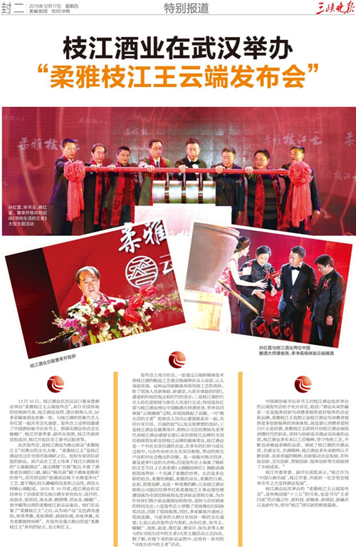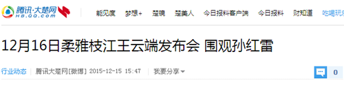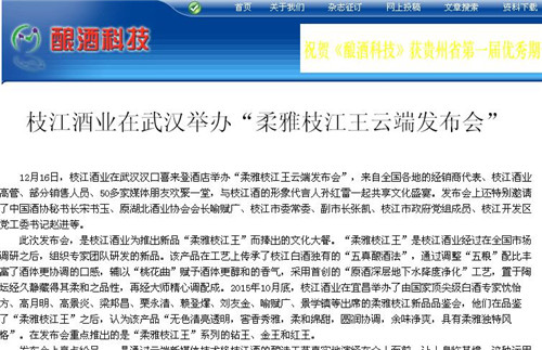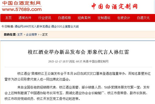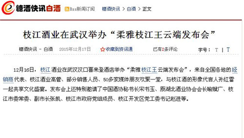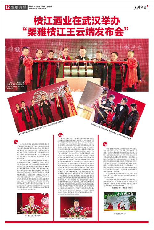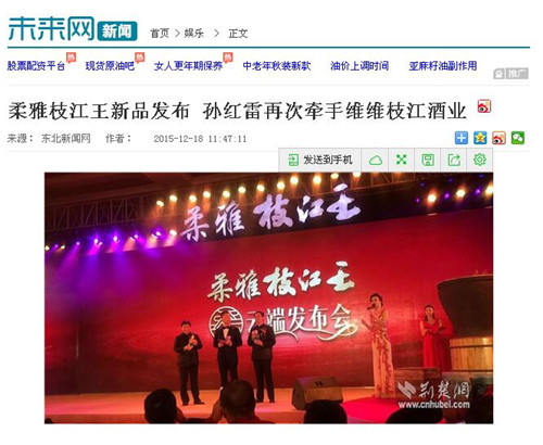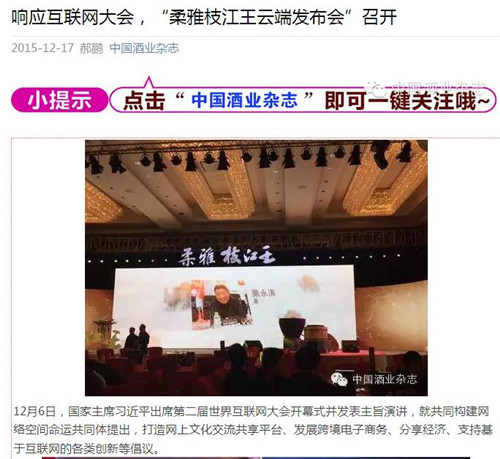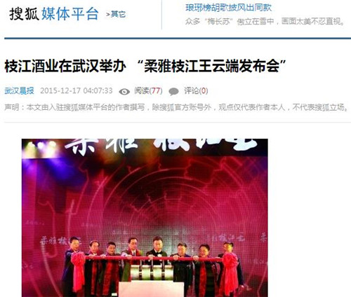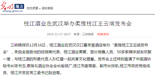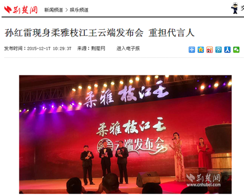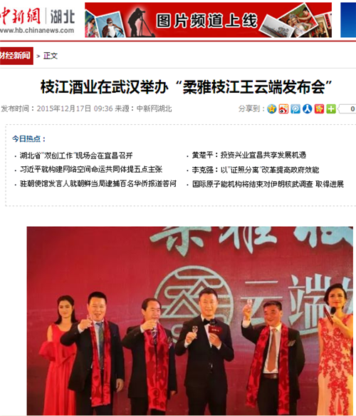 枝江酒業(yè)12月16日在武漢漢口喜來登酒店舉辦的“柔雅枝江王云端發(fā)布會(huì)”,受到了媒體界朋友的廣泛關(guān)注。兩天來,有近百家媒體報(bào)道和轉(zhuǎn)載。有新華網(wǎng)湖北、中新網(wǎng)湖北、騰訊大楚網(wǎng)、光明網(wǎng)、新民網(wǎng)、新浪、搜弧、中國網(wǎng)湖北、荊楚網(wǎng)、消費(fèi)日?qǐng)?bào)網(wǎng)、釀酒科技、長(zhǎng)江網(wǎng)、漢網(wǎng)、糖酒快訊、中國酒業(yè)、中華網(wǎng)、第一農(nóng)經(jīng)等網(wǎng)絡(luò)媒體,有湖北日?qǐng)?bào)、武漢晨報(bào)、三峽日?qǐng)?bào)、三峽晚報(bào)、三峽商報(bào)、湖北畫報(bào)等報(bào)紙媒體;有枝江酒業(yè)12月16日在武漢漢口喜來登酒店舉辦的“柔雅枝江王云端發(fā)布會(huì)”,受到了媒體界朋友的廣泛關(guān)注。兩天來,有近百家媒體報(bào)道和轉(zhuǎn)載。有新華網(wǎng)湖北、中新網(wǎng)湖北、騰訊大楚網(wǎng)、光明網(wǎng)、新民網(wǎng)、新浪、搜弧、中國網(wǎng)湖北、荊楚網(wǎng)、消費(fèi)日?qǐng)?bào)網(wǎng)、釀酒科技、長(zhǎng)江網(wǎng)、漢網(wǎng)、糖酒快訊、中國酒業(yè)、中華網(wǎng)、第一農(nóng)經(jīng)等網(wǎng)絡(luò)媒體,有湖北日?qǐng)?bào)、武漢晨報(bào)、三峽日?qǐng)?bào)、三峽晚報(bào)、三峽商報(bào)、湖北畫報(bào)等報(bào)紙媒體;有湖北電視臺(tái)、三峽電視臺(tái)、枝江電視臺(tái)等電視媒體;有“玩轉(zhuǎn)宜昌”、“酒說”等眾多微信平臺(tái)。尤其是微信新媒體,傳播快,關(guān)于“柔雅枝江王云端發(fā)布會(huì)”的報(bào)道被眾多關(guān)注枝江酒業(yè)、關(guān)注柔雅枝江王新品的消費(fèi)者和孫紅雷的粉絲刷屏。湖北電視臺(tái)、三峽電視臺(tái)、枝江電視臺(tái)等電視媒體;有“玩轉(zhuǎn)宜昌”、“酒說”等眾多微信平臺(tái)。尤其是微信新媒體,傳播快,關(guān)于“柔雅枝江王云端發(fā)布會(huì)”的報(bào)道被眾多關(guān)注枝江酒業(yè)、關(guān)注柔雅枝江王新品的消費(fèi)者和孫紅雷的粉絲刷屏。