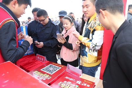 開(kāi)幕式現(xiàn)場(chǎng)在枝江酒業(yè)展臺(tái)參加掃二維碼贈(zèng)送枝江酒活動(dòng)的觀眾